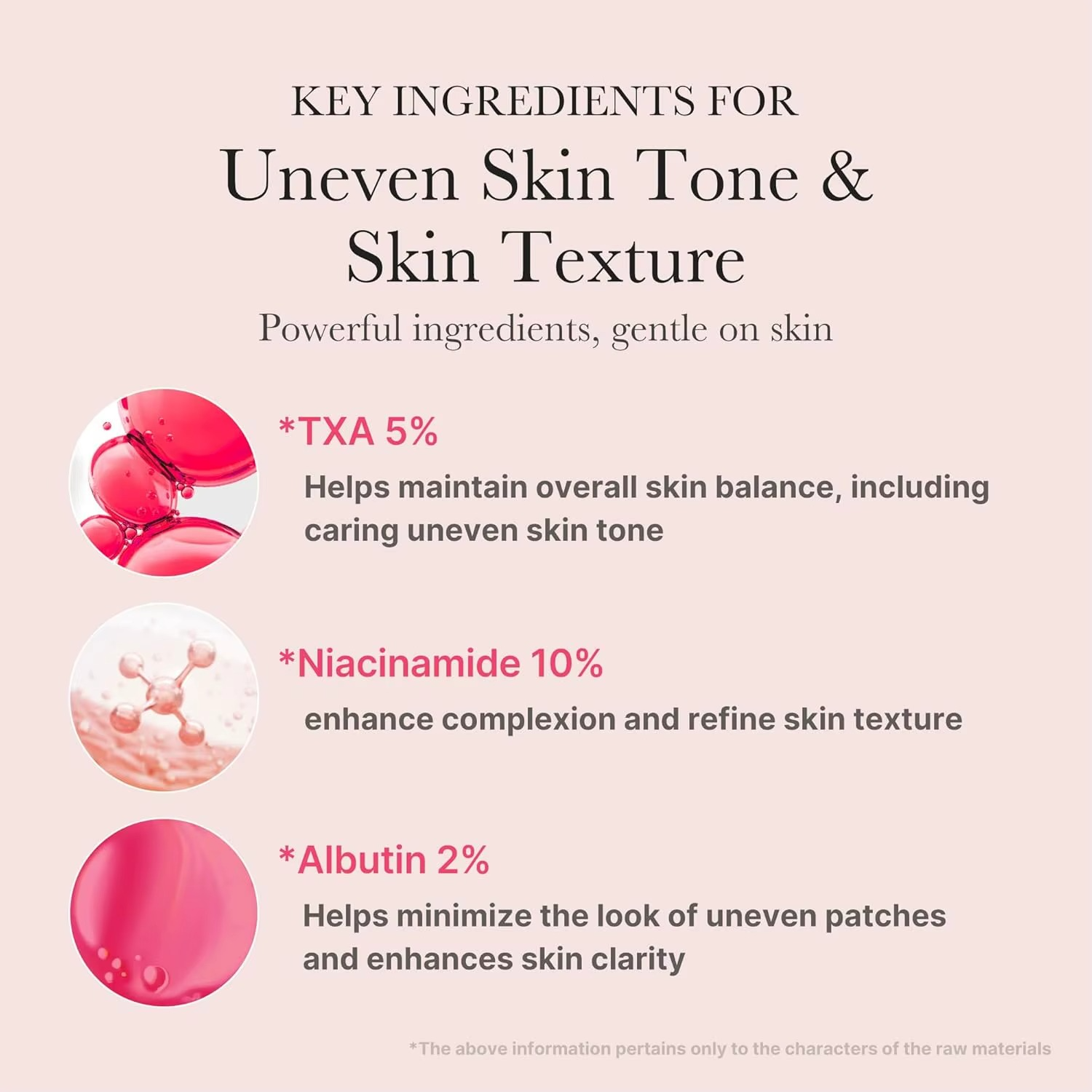 Combines 5% TXA, 10–15% niacinamide, and ~2% arbutin